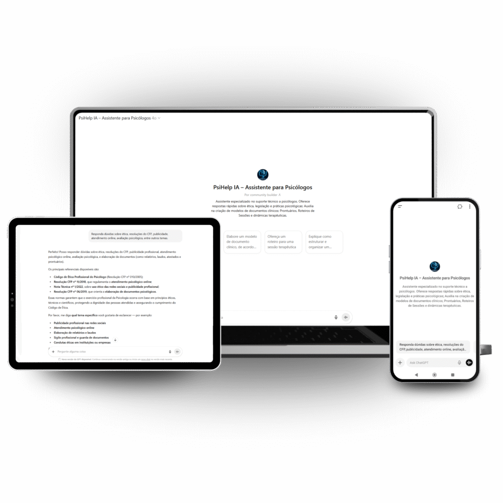Inteligência artificial disponível 24h para suporte técnico, ético e prático. Contém respostas sobre ética, modelos clínicos, roteiros e dinâmicas terapêuticas. Tenha orientação imediata e economize tempo nas tarefas da rotina clínica.